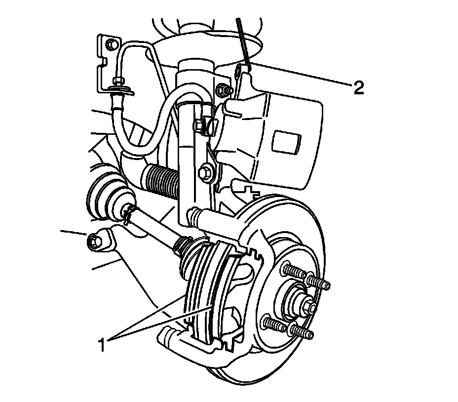 1. Remove the brake caliper from the brake caliper mounting bracket and support the brake caliper with heavy mechanics wire (2) or equivalent. Do NOT disconnect the hydraulic brake flexible hose from the caliper. Refer to Front Brake Caliper Replacement (With RPO LNF) (Front Brake Caliper Replacement)Front Brake Caliper Replacement (Without RPO LNF) (Front Brake Caliper Replacement).