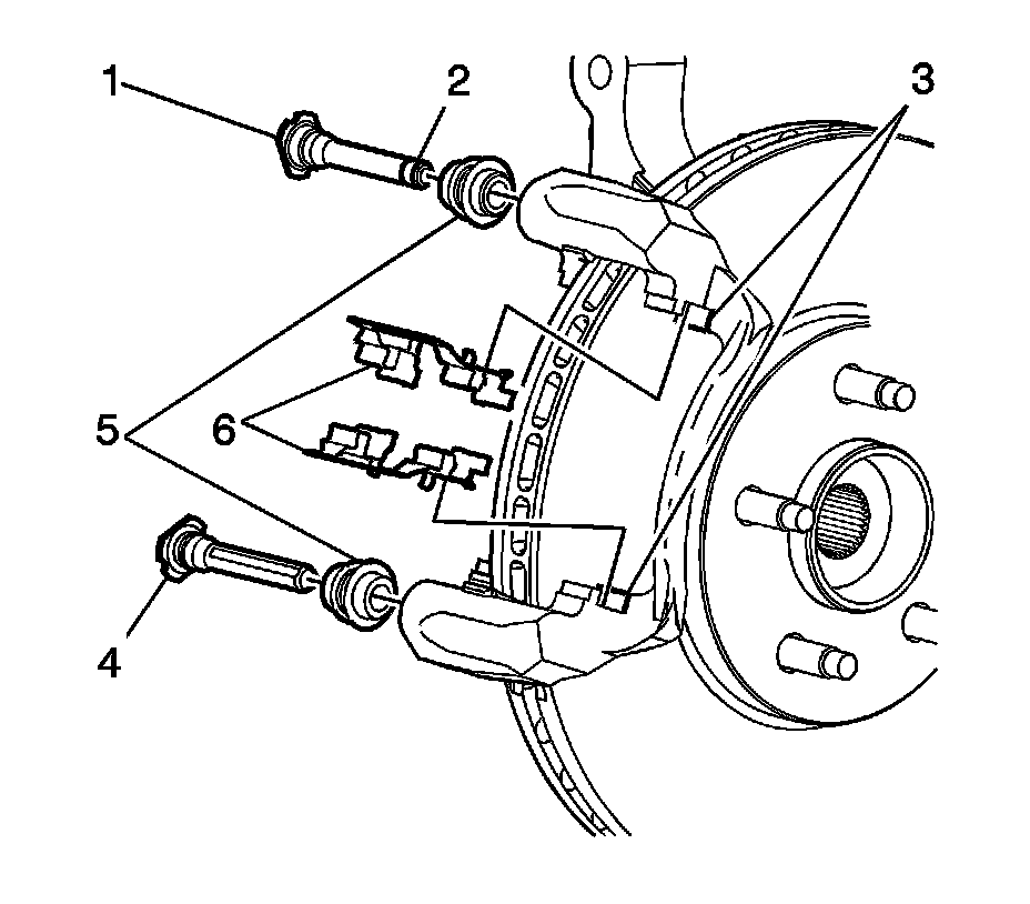 Caution: Support the brake caliper with heavy mechanic wire, or equivalent, whenever it is separated from its mount and the hydraulic flexible brake hose is still connected. Failure to support the caliper in this manner will cause the flexible brake hose to bear the weight of the caliper, which may cause damage to the brake hose and in turn may cause a brake fluid leak.
