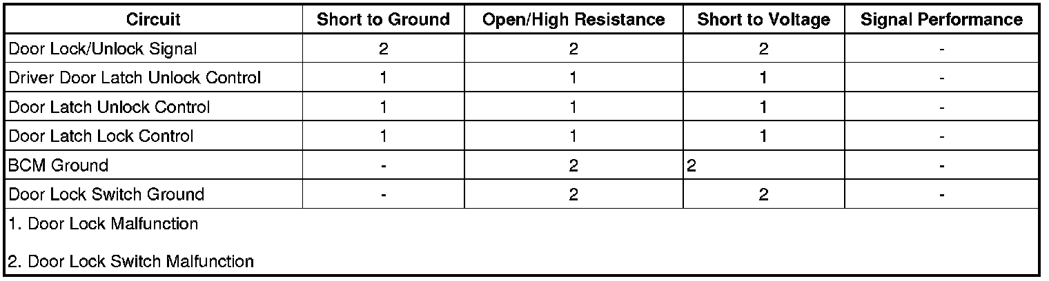 The BCM powers the reversible door latch assemblies by providing battery positive voltage and ground to the appropriate lock and unlock control circuits of the door latch assemblies. The lock control circuits of the driver and passenger door latch assemblies are all connected together; however, the unlock control circuits are connected in a slightly different way. While the unlock control circuits for the passenger door latch assemblies are connected together, the door latch assembly has a separate unlock control circuit. The system is designed this way so that the keyless entry transmitter may be used to unlock only the driver door. Despite this difference, all lock actuators perform much the same way. When the door latch assemblies are not active, all actuator lock and unlock control circuits are at ground potential within the BCM. Transitioning of the lock actuators to the lock or unlocked position depends upon which control circuits receive voltage and which control circuits receive ground.