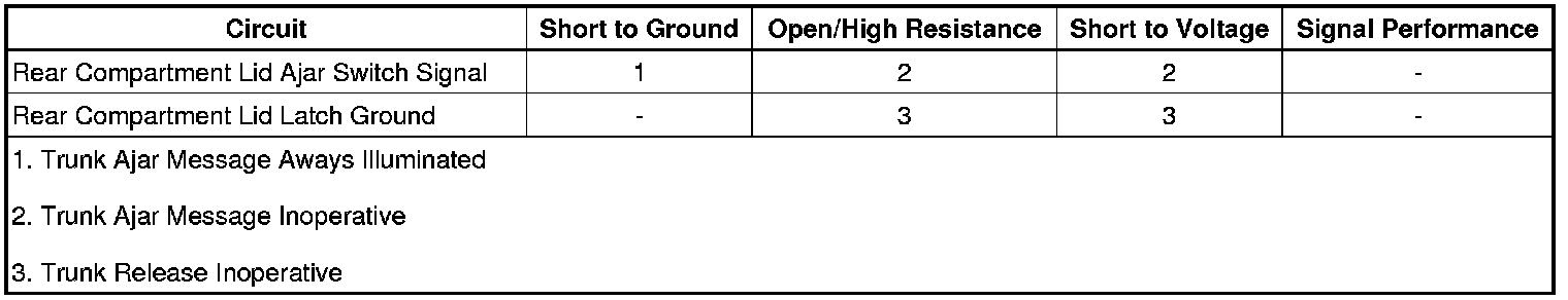 When the ignition is ON, the body control module (BCM) supplies battery positive voltage to the rear compartment lid ajar switch through the rear compartment lid ajar switch signal circuit. When the rear compartment lid is opened, the signal circuit is connected to ground through the rear compartment lid ajar switch ground circuit and the voltage is pulled low within the BCM. In response, the BCM sends a serial data message to the driver information center (DIC) in the instrument panel cluster (IPC) to illuminate the rear compartment lid ajar indicator.