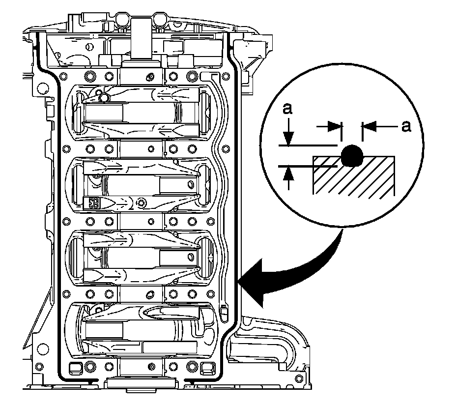 4. Apply a 4.25 mm bead of sealer, dimension (a), directly in the groove of the block to bedplate mating surfaces. Refer to Adhesives, Fluids, Lubricants, and Sealers (Specifications).