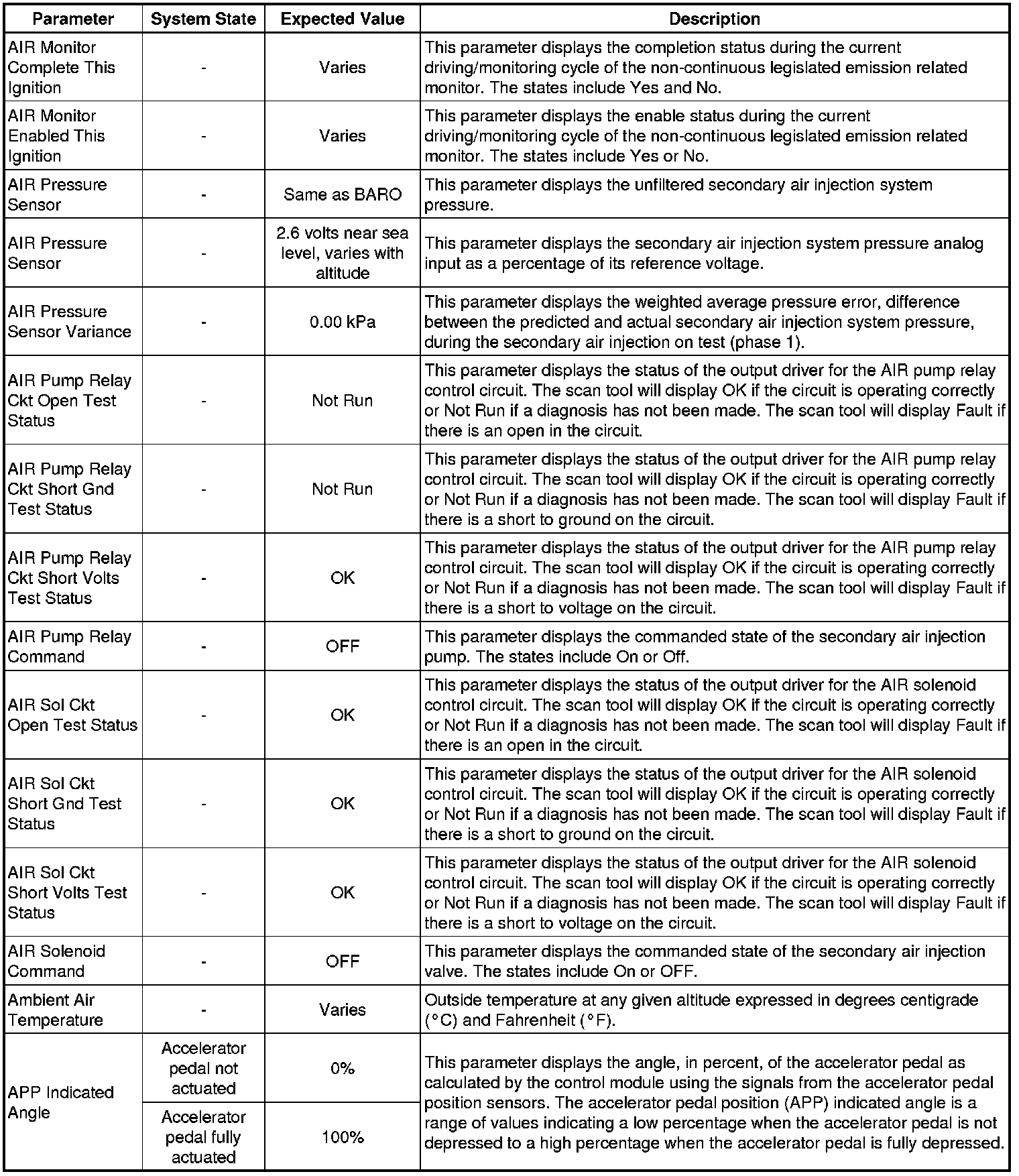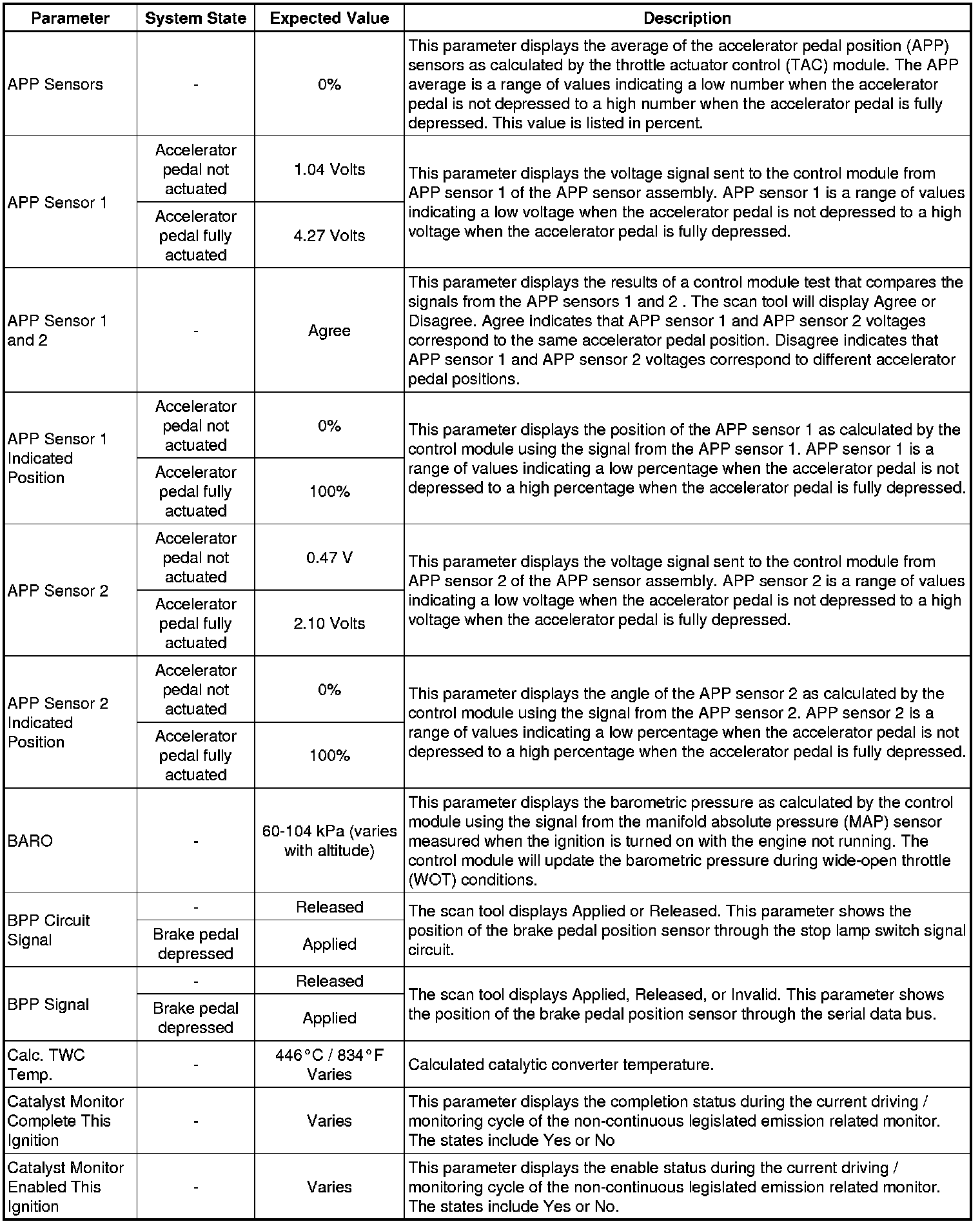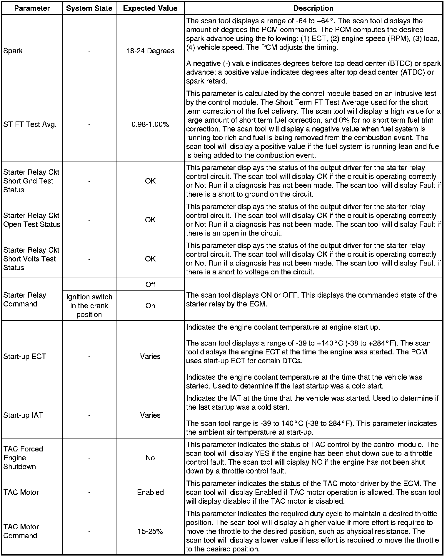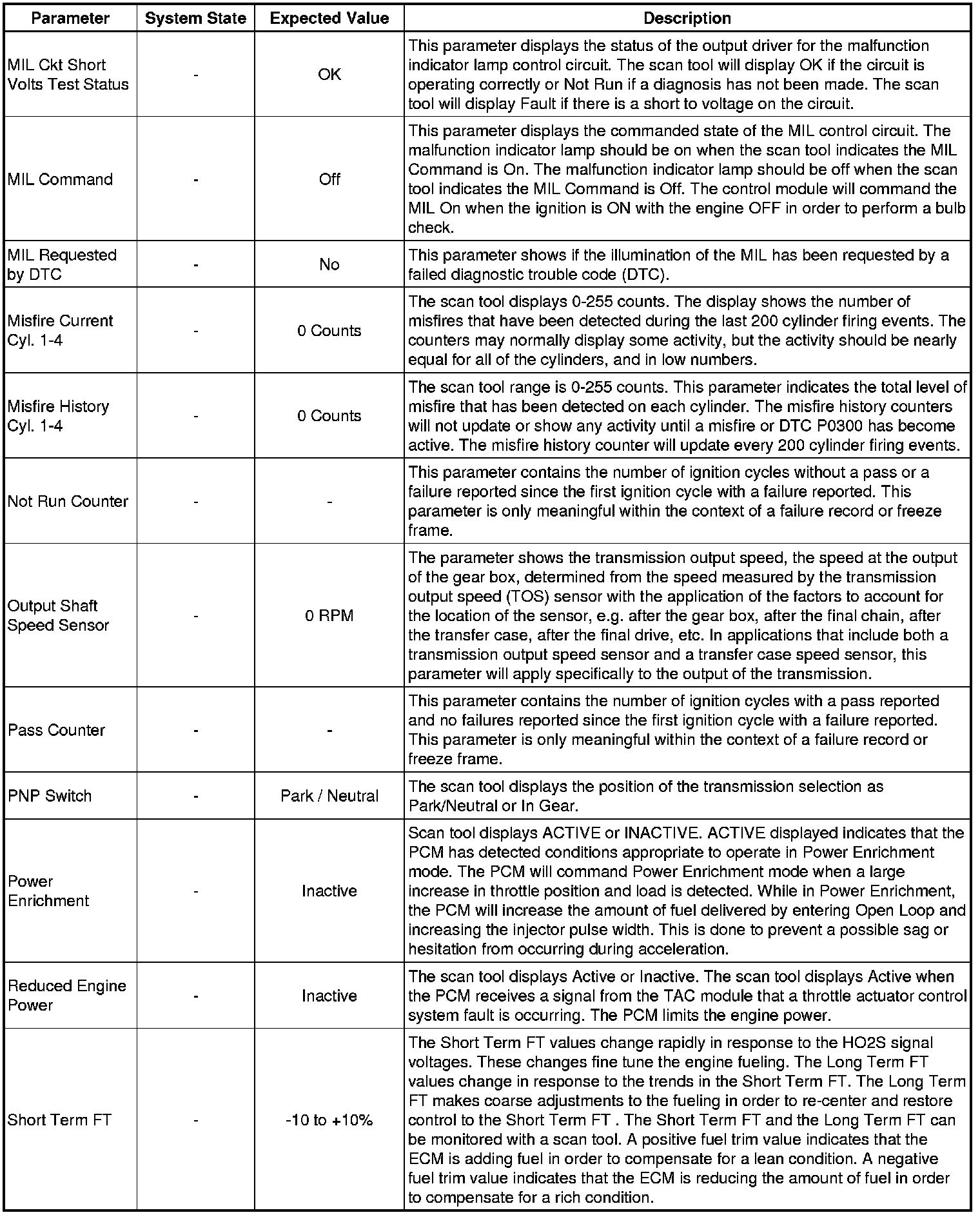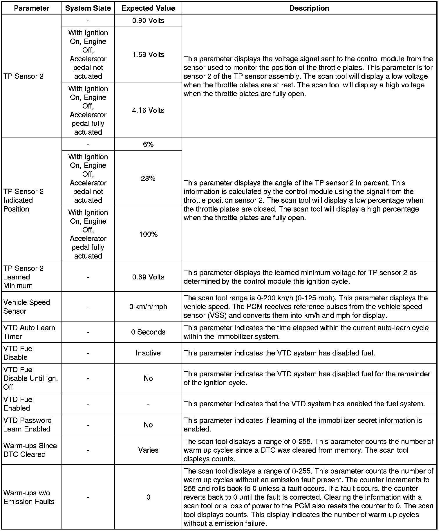 Only the parameters listed below are referenced in this service manual for use in diagnosis. If all values are within the typical range described below, refer to Symptoms - Engine Controls (- Symptoms - Engine Controls) for the 2.4L engine for diagnosis.