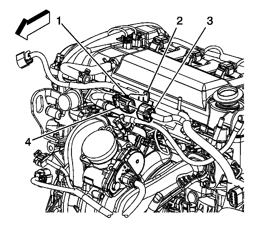 3. Disconnect the fuel feed line quick connect fitting (3) from the fuel rail. Refer to Metal Collar Quick Connect Fitting Service (Metal Collar Quick Connect Fitting Service).