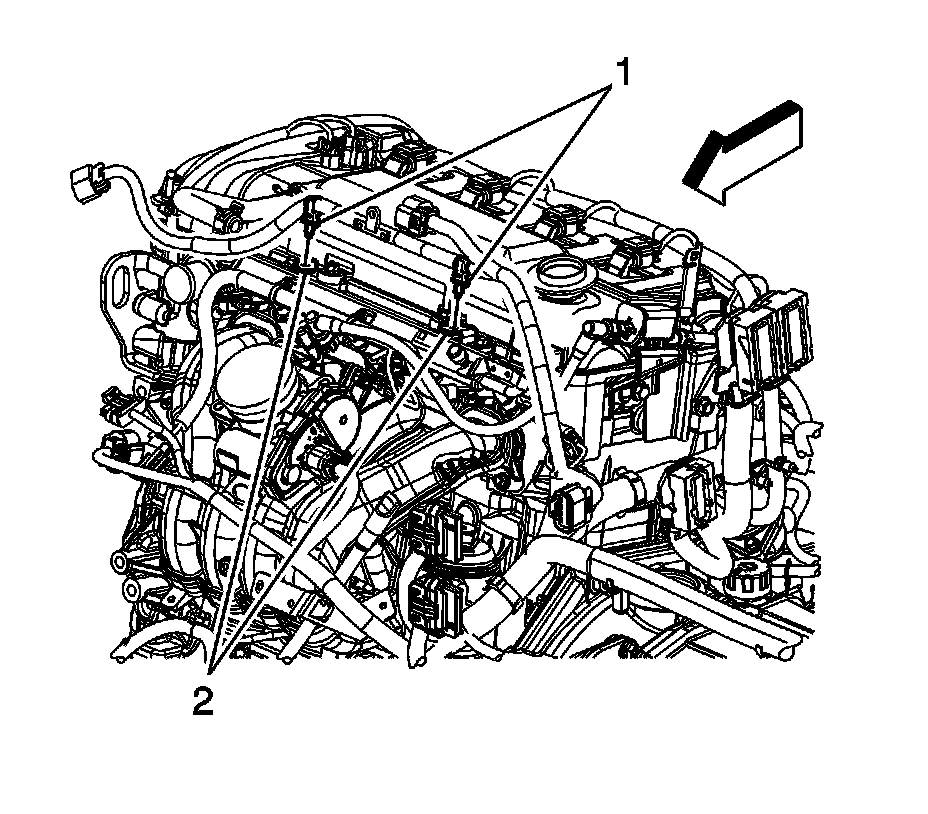 10. Install the engine wiring harness clips (1) to the fuel rail tabs (2).