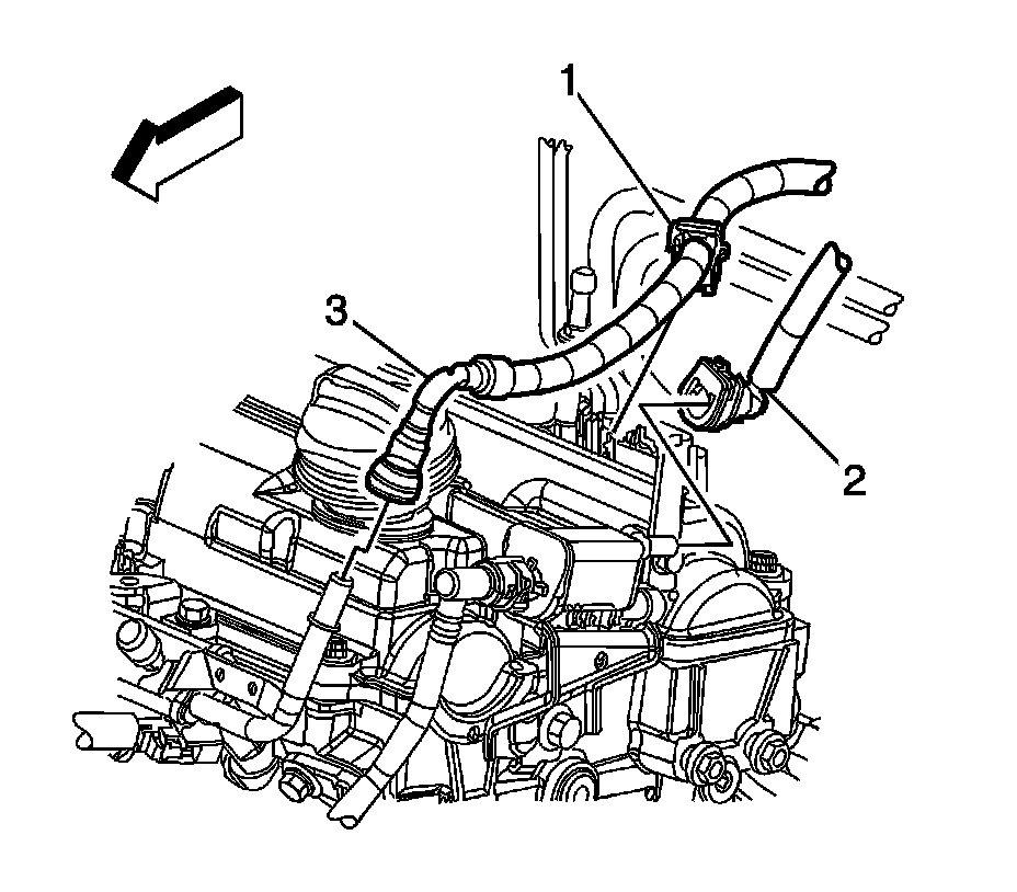 5. Disconnect the evaporative emission (EVAP) line quick connect fitting (2) from the EVAP purge solenoid. Refer to Plastic Collar Quick Connect Fitting Service (Plastic Collar Quick Connect Fitting Service).