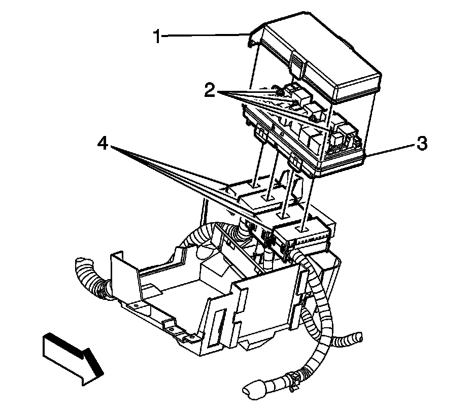5. Reposition the junction block (3) and harness connectors (4) from the battery tray.