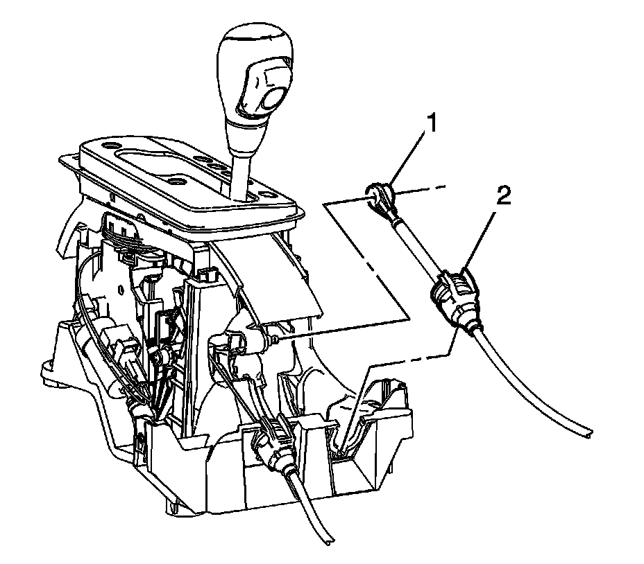 3. Remove the retainer (2) from the transaxle shift control cable.