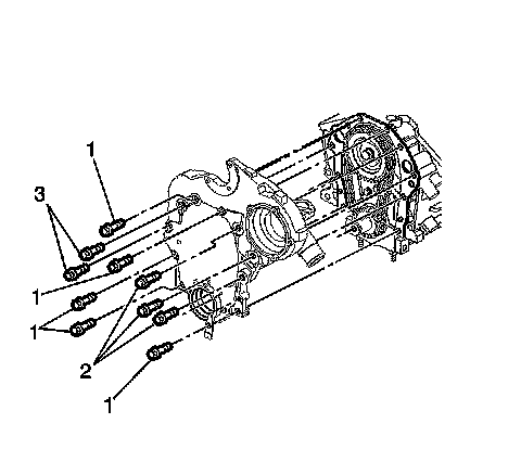 * Tighten the large engine front cover bolts (2, 3) to 55 Nm (41 lb ft).