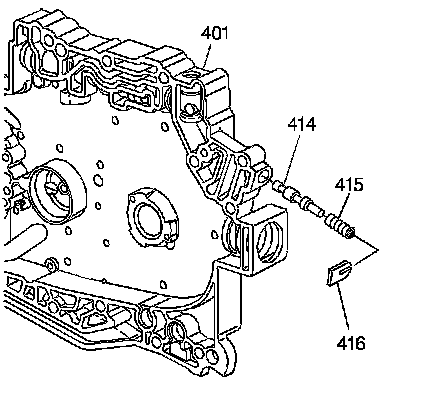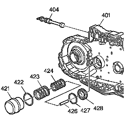 6. Insert the 3-4 accumulator piston pin (426) through the front of the case cover (401) and into the 3-4 accumulator piston (428).