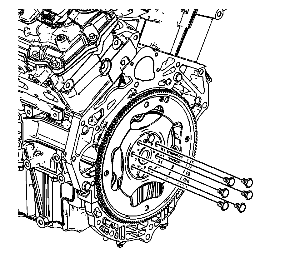 2. Install 2 NEW bolts in location at the top and bottom of the engine flywheel bolt pattern allowing the engine flywheel to hang in position.