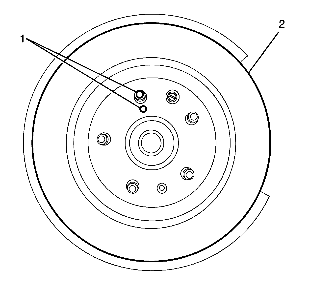3. Install the brake disc (2) to the hub/axle flange. Use the matchmark (1) made prior to removal for correct orientation to the flange.