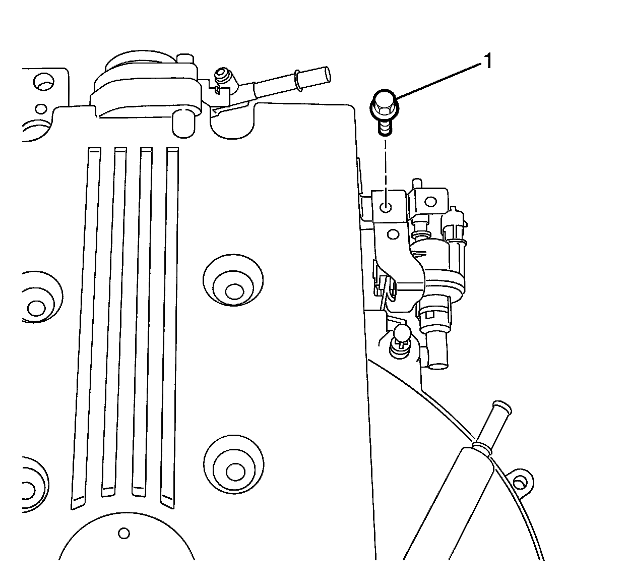 2. Remove the fuel injector wiring harness bracket to upper intake manifold retaining bolt (1).
