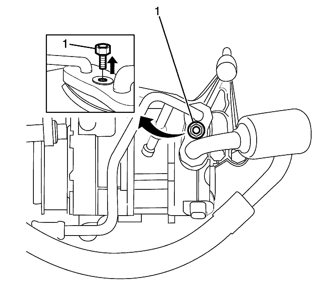 8. Install the suction/discharge pipe pad to compressor retaining bolt (1) and tighten to 22 Nm (16 lb ft).