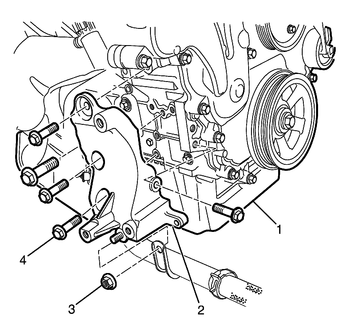 1. Install the alternator bracket (2) to the engine block.
