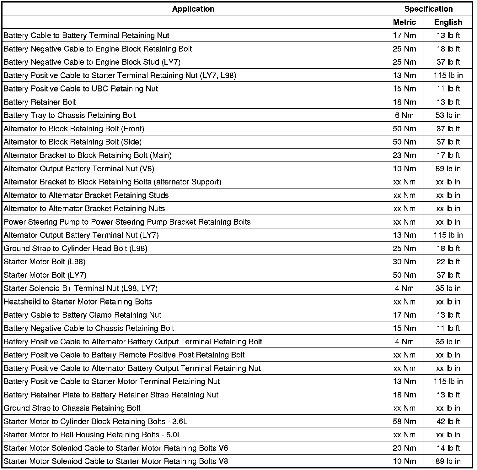 Starting and Charging: Specifications