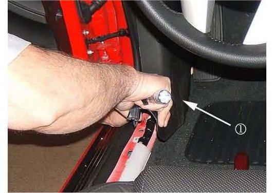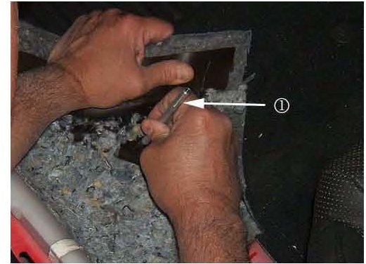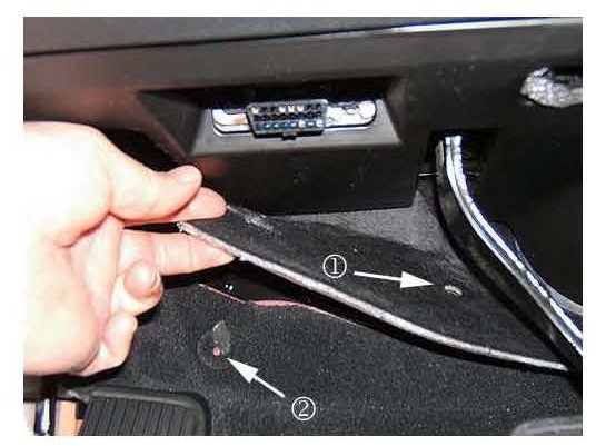 7. In order to gain access to the underside of the carpet, remove the two forward carpet retainers. The first retainer (1) is located on the carpet insulator, the second (2) is located underneath.