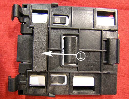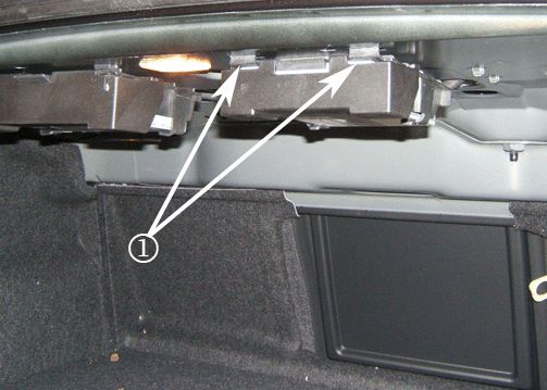 1. Locate the XM module under the rear package shelf. Release the two retaining tabs (1) as shown or push on the bracket toward the front of vehicle and pull downward, which may release it without the need for tools.
