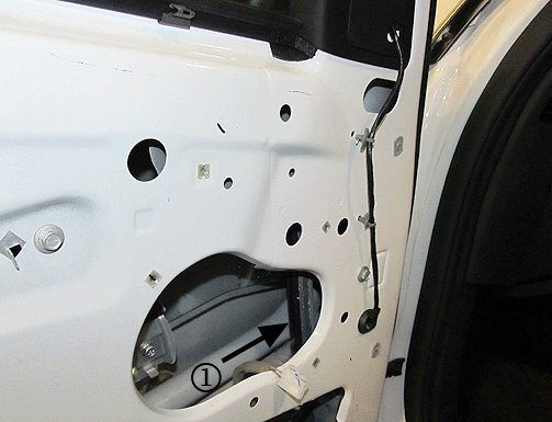 5. While fastening the lower bolt (1), hold the channel rearward in the door to bias the bolt rearward in the hole. Once positioned, tighten the bolt.