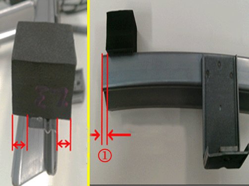 2. Fit the foam spacer to the bottom outboard side of the new replacement front window run channel, in the location shown in the graphic above. Ensure that the spacer is centered, glue side down, on the channel and positioned 5 mm (0.20 in) (1) from the bottom end.