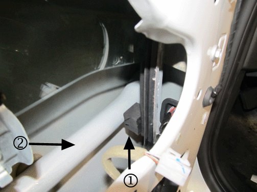 3. Position the new front window run channel into the door, and ensure that the foam spacer (1) touches against the side intrusion beam (2) as shown above.