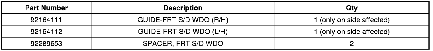 Replace the window front run channel on the affected door, and add the GM service part foam spacer (noted in the part table below) to BOTH front doors, following the steps below: