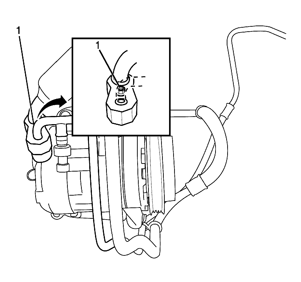 7. Install the suction/discharge pipes pad to compressor retaining bolt (1) and tighten to 22 Nm (16 lb ft).
