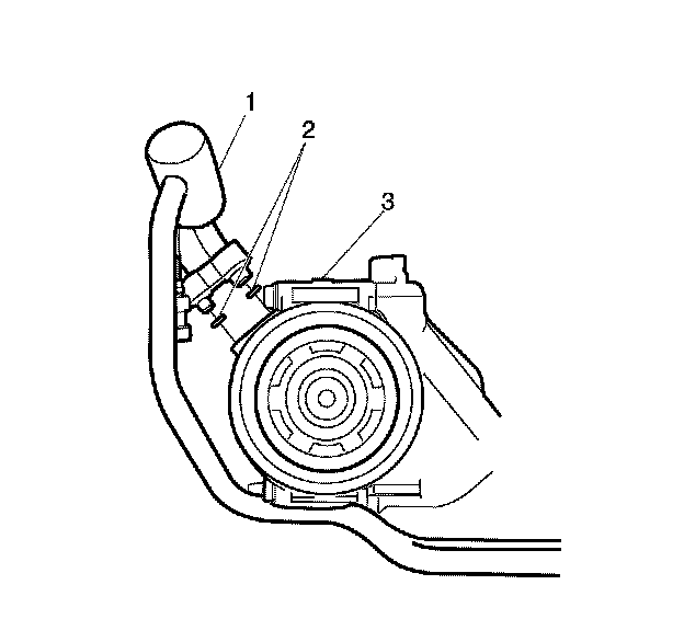 Note: Remove the compressor (2) from the compressor mounting bracket (3) by sliding forwards and than tilting upwards out of the engine compartment.