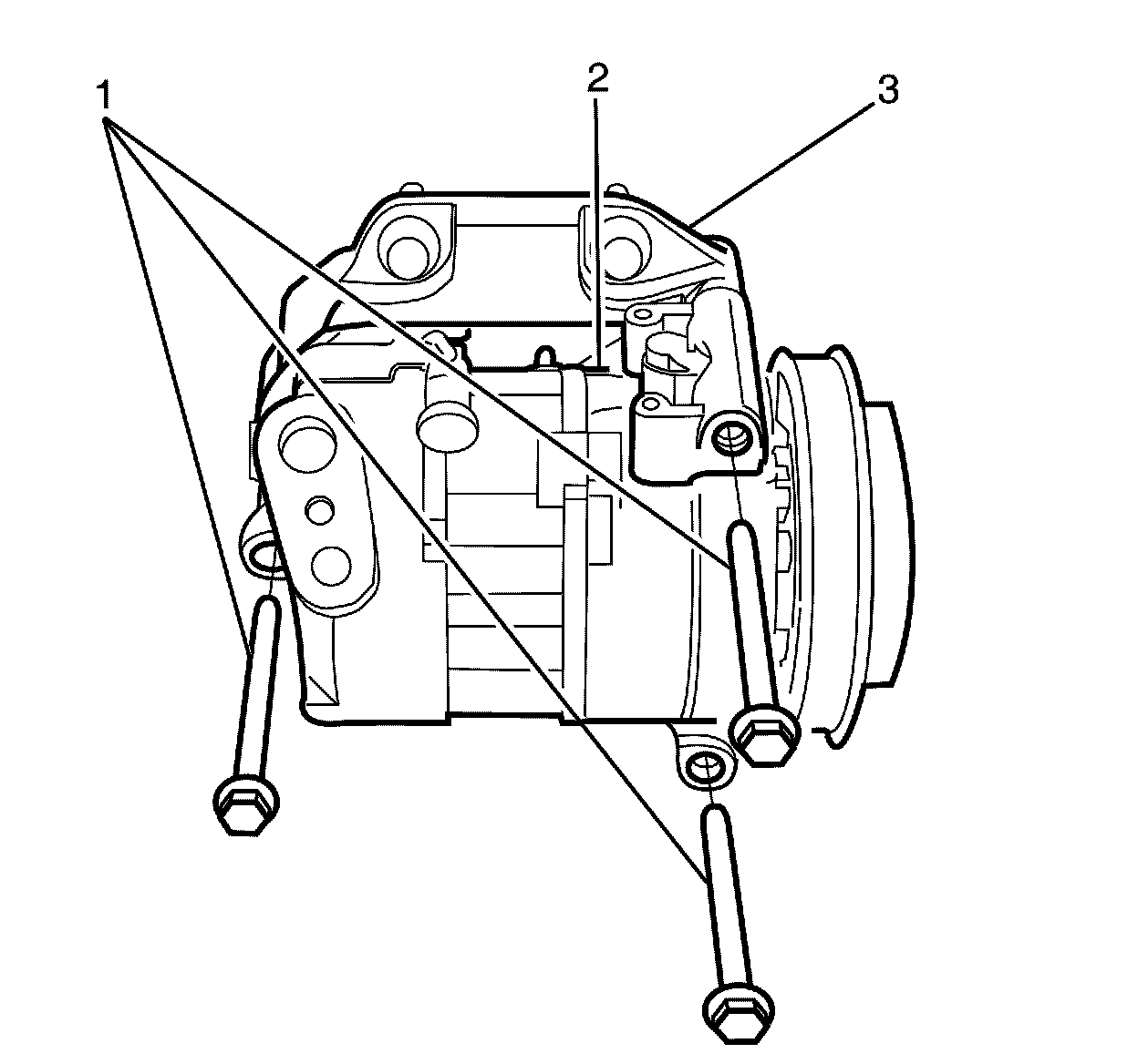 2. Install the compressor (2) to the compressor mounting bracket (3).