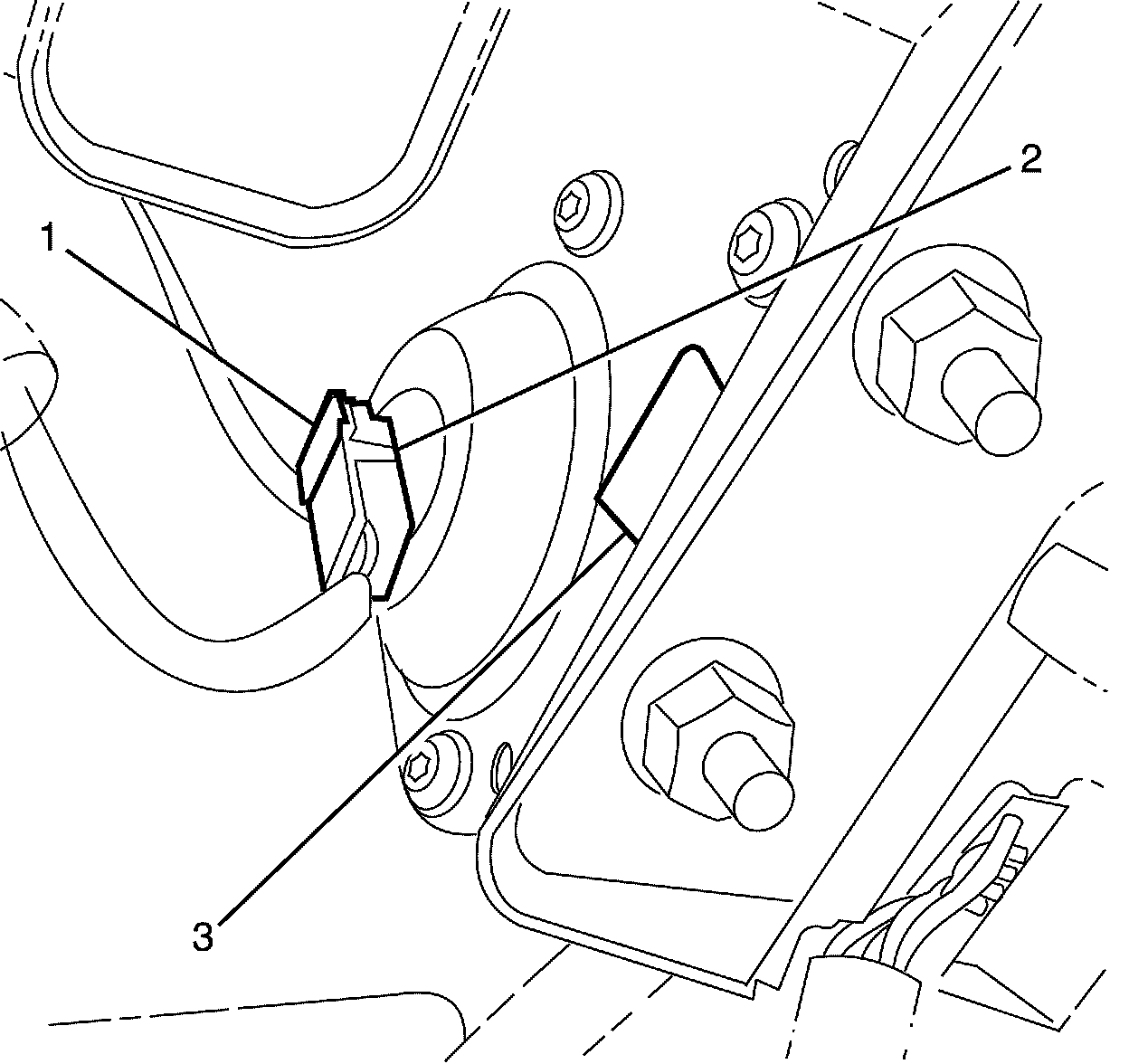 74. Release the electrical connector retaining clip (1) and disconnect the electrical connector (2) from the air bag (3).