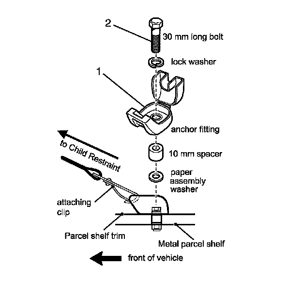 2. Remove the child seat anchor assembly (1) that is being serviced from the rear window shelf.