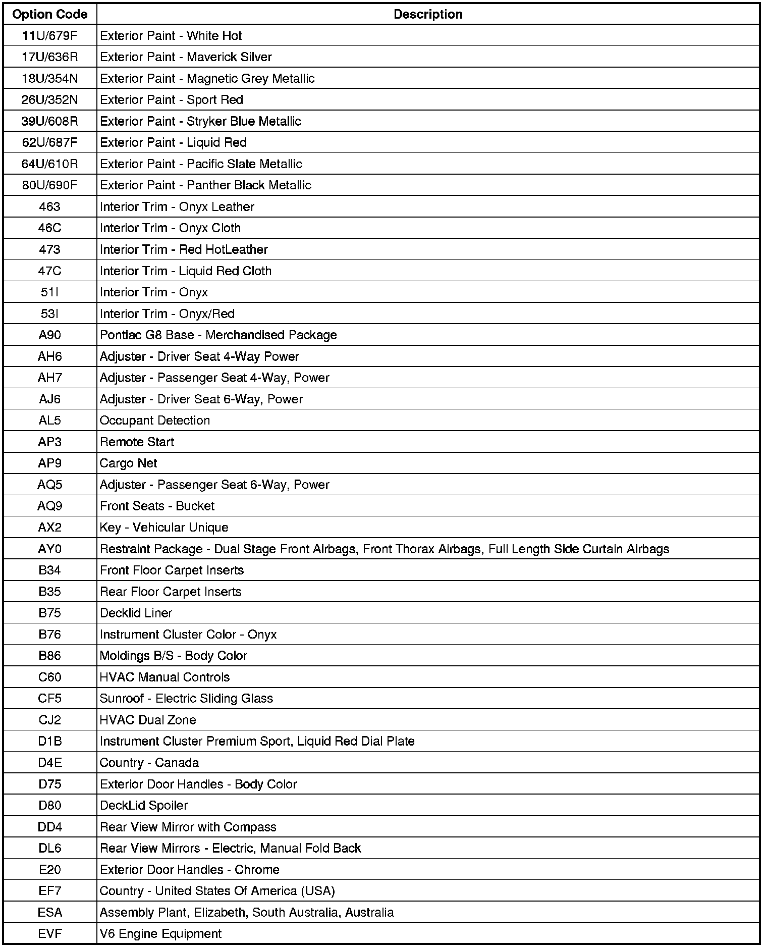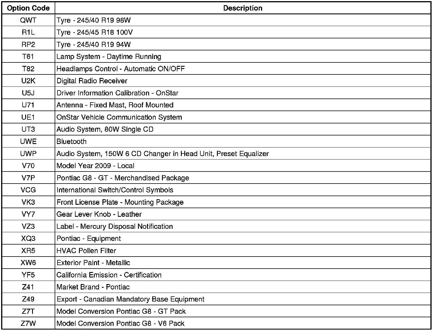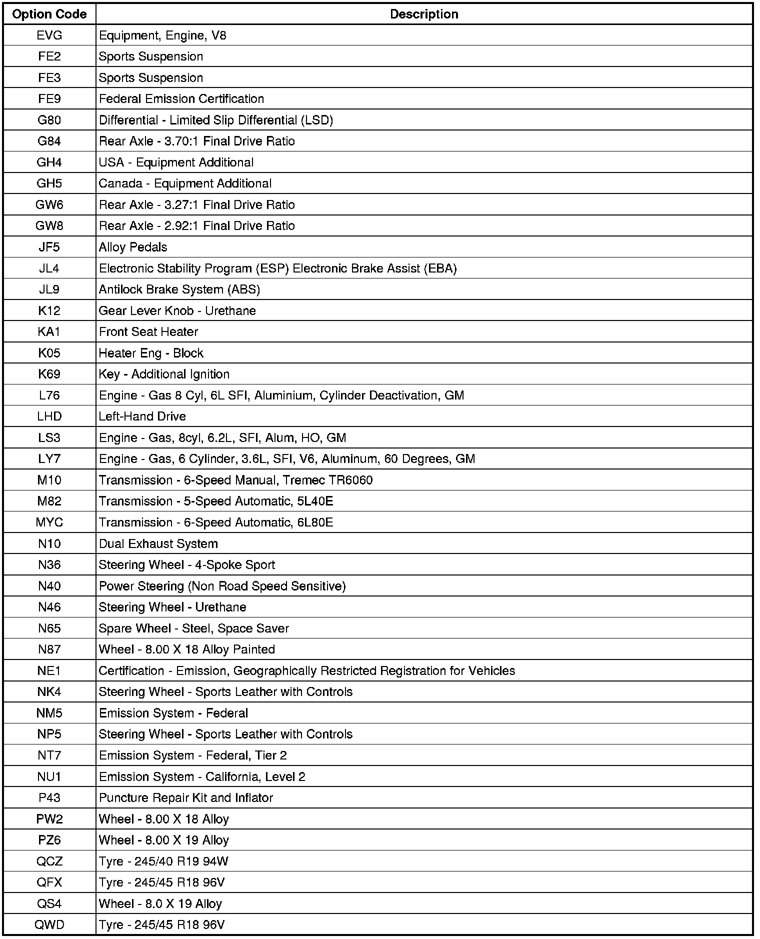 RPO Code List