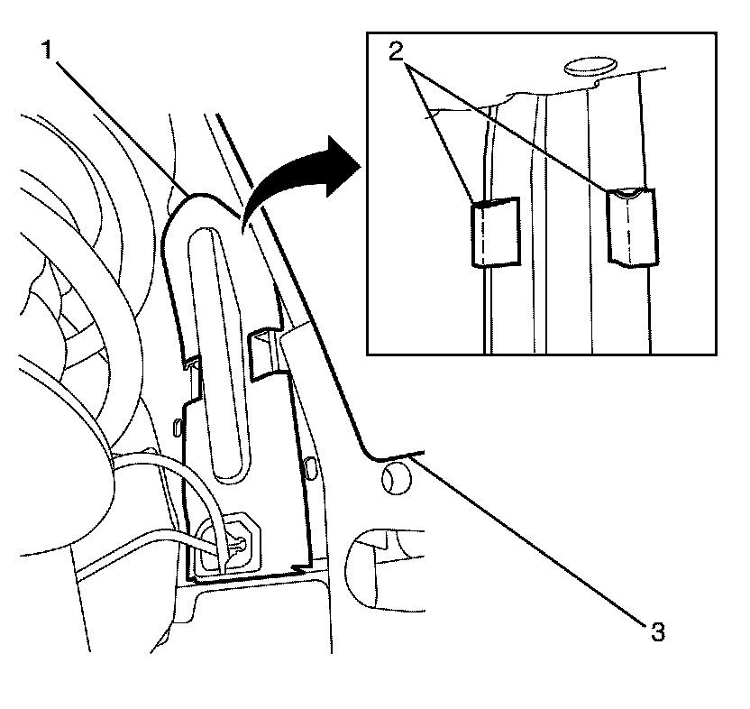 Note:Make sure the splash guard clips (2) are correctly engaged with the wheel house (3) to prevent an induced rattle condition.