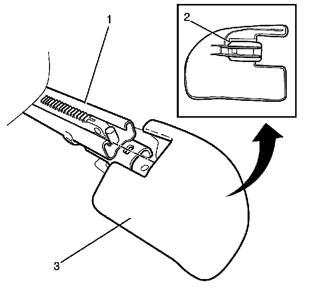 Important: Grasp the base of the front seat inner front track cover and disengage the retaining clip from the seat track (2).