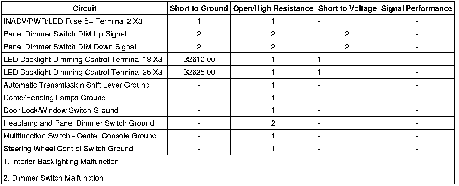 The up/down dimmer controls located on the headlamp and panel dimmer switch is used to increase and decrease the brightness of the interior backlighting components. Each dimmer control switch provides a voltage signal that will increase as the brightness of the lights are increased and decrease as the brightness of the lights are decreased. The body control module (BCM) supplies each dimmer control switch with a signal circuit. When either the up or down dimmer control switch is placed in the desired position, the dimmed voltage setting is applied from the appropriate dimmer control switch through the dimmer switch signal circuit to the BCM. The BCM interprets the signal and applies the dimmed voltage to the LED backlight dimming control circuits and the interior backlighting components dim to the requested level.