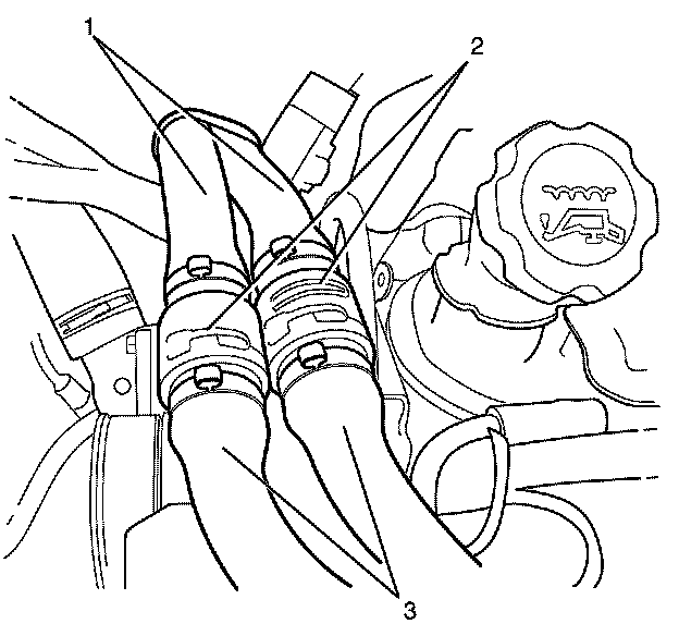 3. Using J 38185 compress the heater hose retaining clamps (1) and slide 50 mm (2 in) along the heater hose (3).