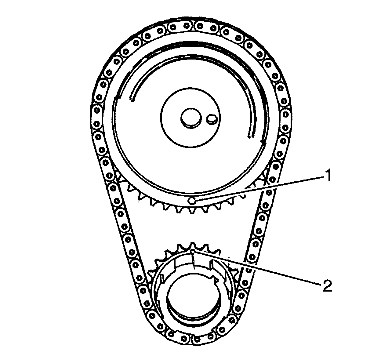 ^ Inspect the sprockets for correct alignment. The mark on the camshaft sprocket (1) should be located in the 6 o'clock position and the mark on the crankshaft sprocket (2) should be located in the 12 o'clock position.