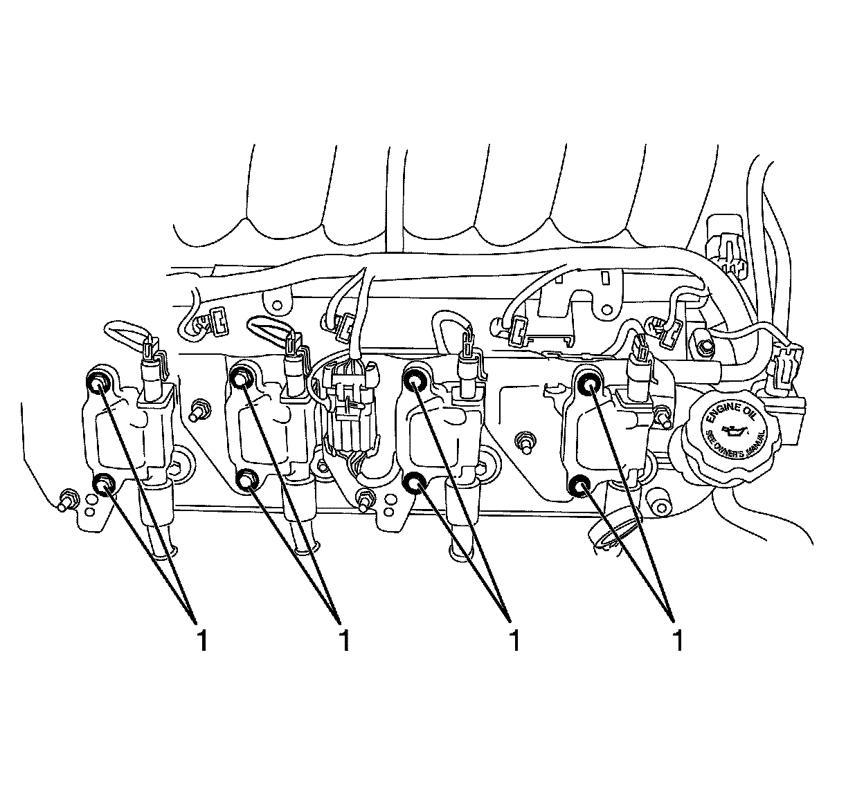 2. Install the ignition coil to ignition coil assembly retaining bolts (1) and tighten to 12 Nm (106 lb in).