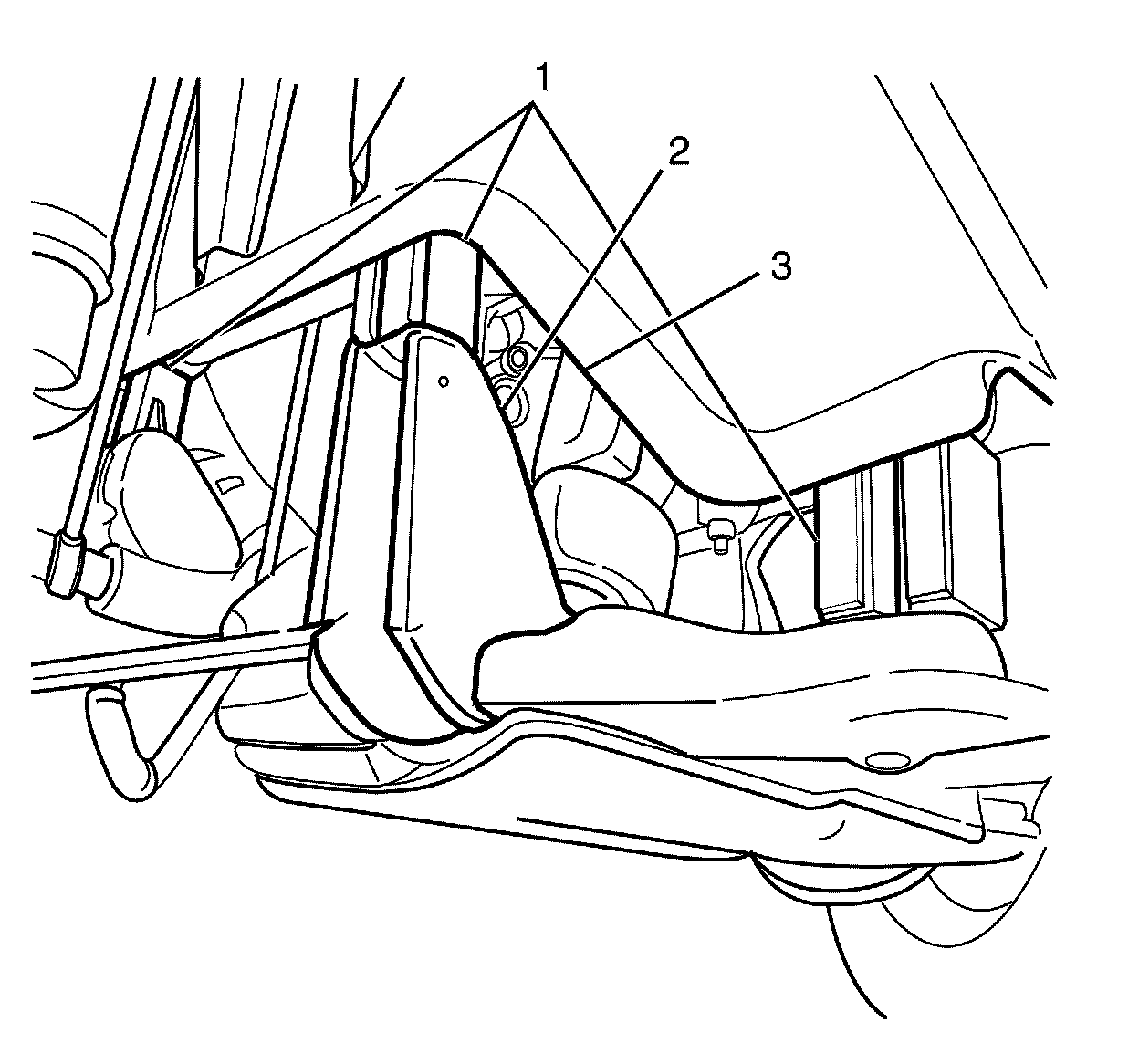 15. Insert 65 mm spacer blocks (1) between sub-frame (2) and chassis rails (3).