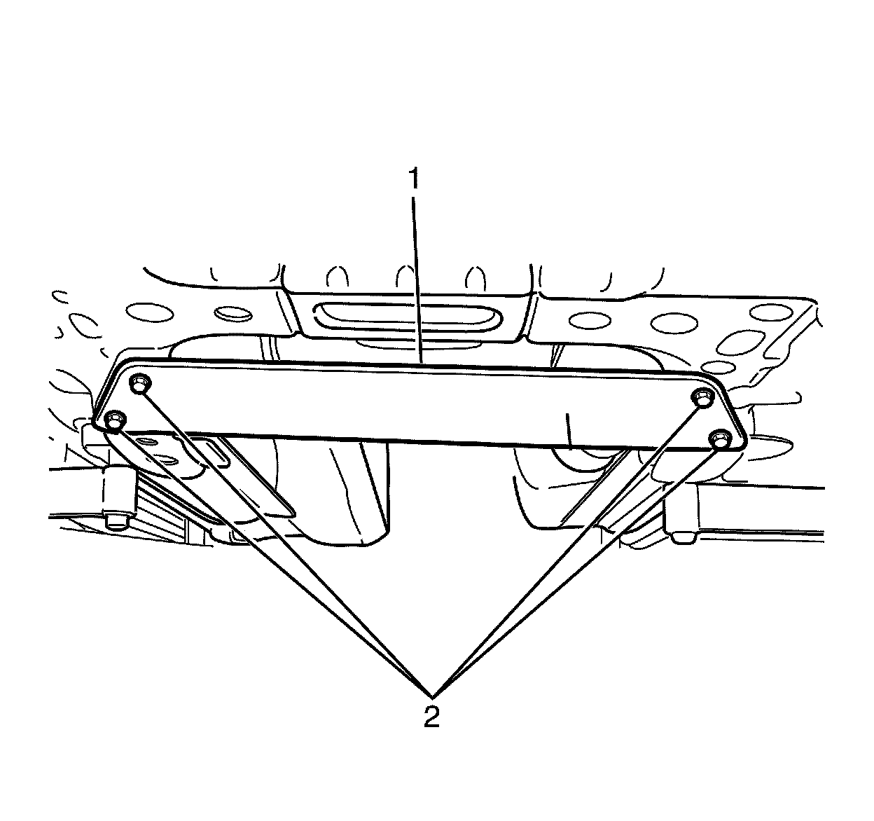 19. Install engine support plate (1) to front sub-frame (2).