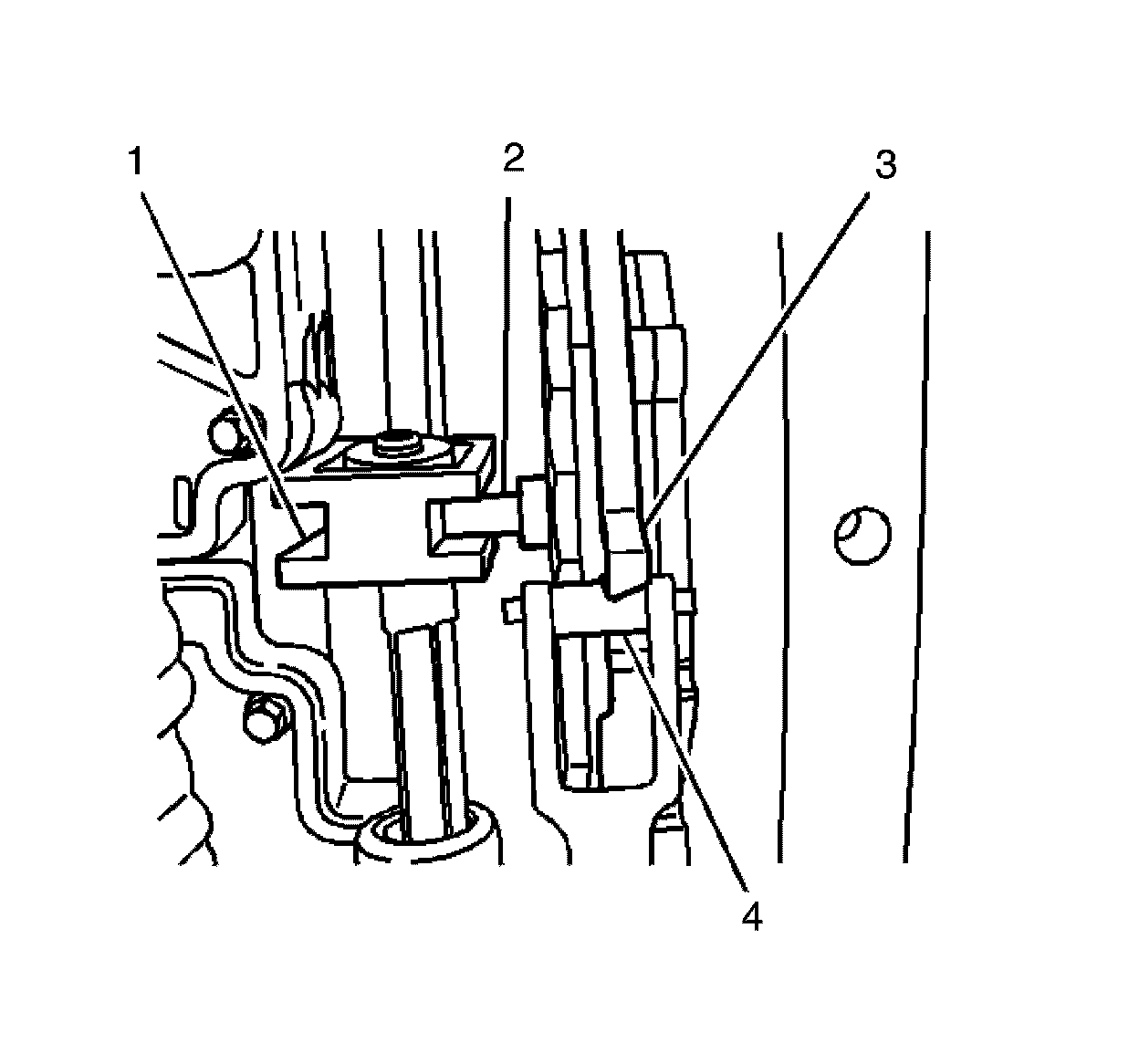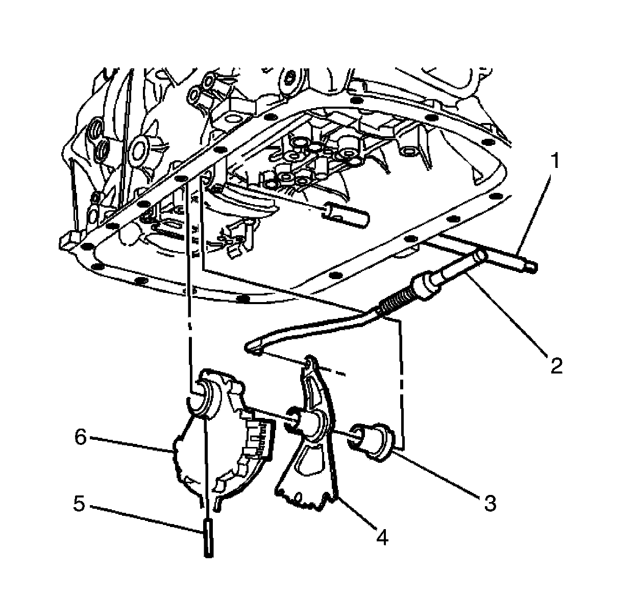1. Install the manual shift shaft position switch (6), the manual shift shaft detent lever (4), the manual shift shaft assembly spacer (3), and the park pawl actuator (2) as an assembly. It may be necessary to push up on the park pawl in order to fully insert the park pawl actuator (2).