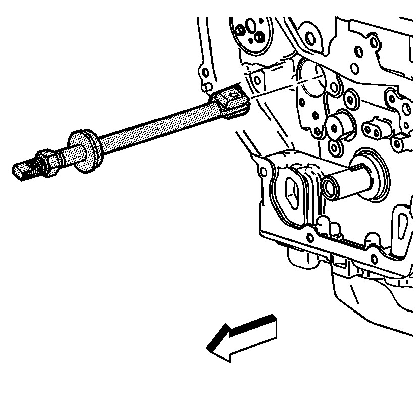 10. Tighten the nut on the J 43650 until the tension releases. When the tension releases, remove the J 43650 and the balance shaft bushing, (right side shown, left side similar).