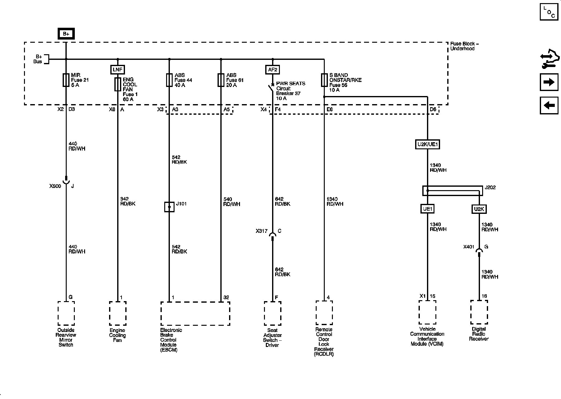 MIR, ENG COOL FAN, ABS, S-BAND ONSTAR/RKE Fuses and PWR SEATS Circuit Breaker