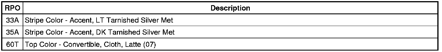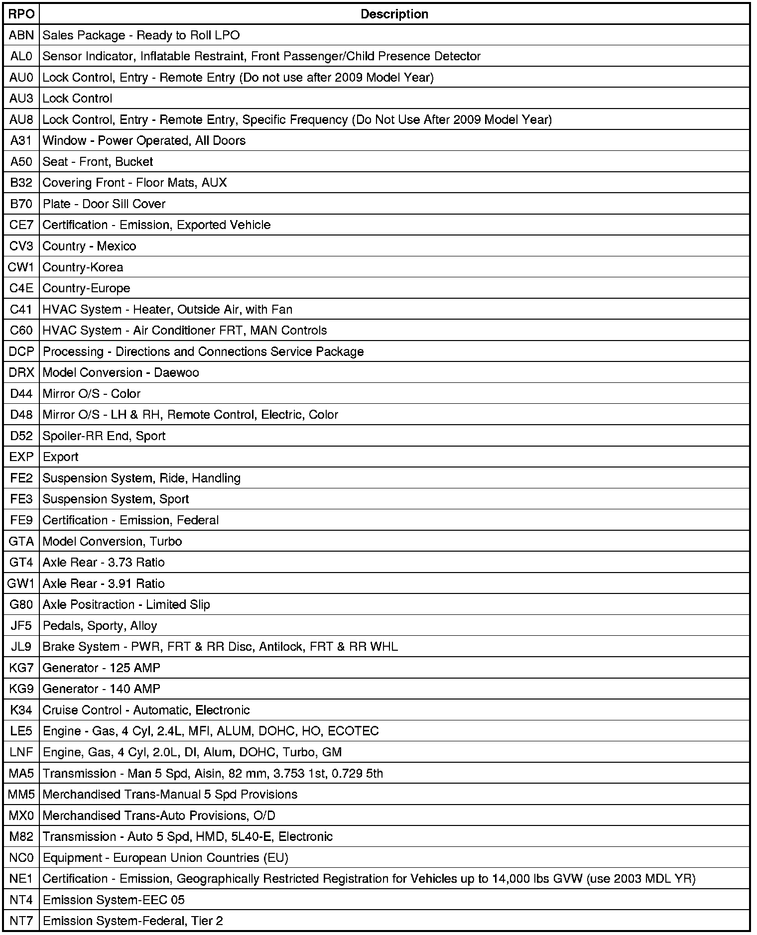 The following table provides the description of the Regular Production Option (RPO) codes that are available on the vehicle. The vehicle RPO list is printed on the Service Parts Identification Label.