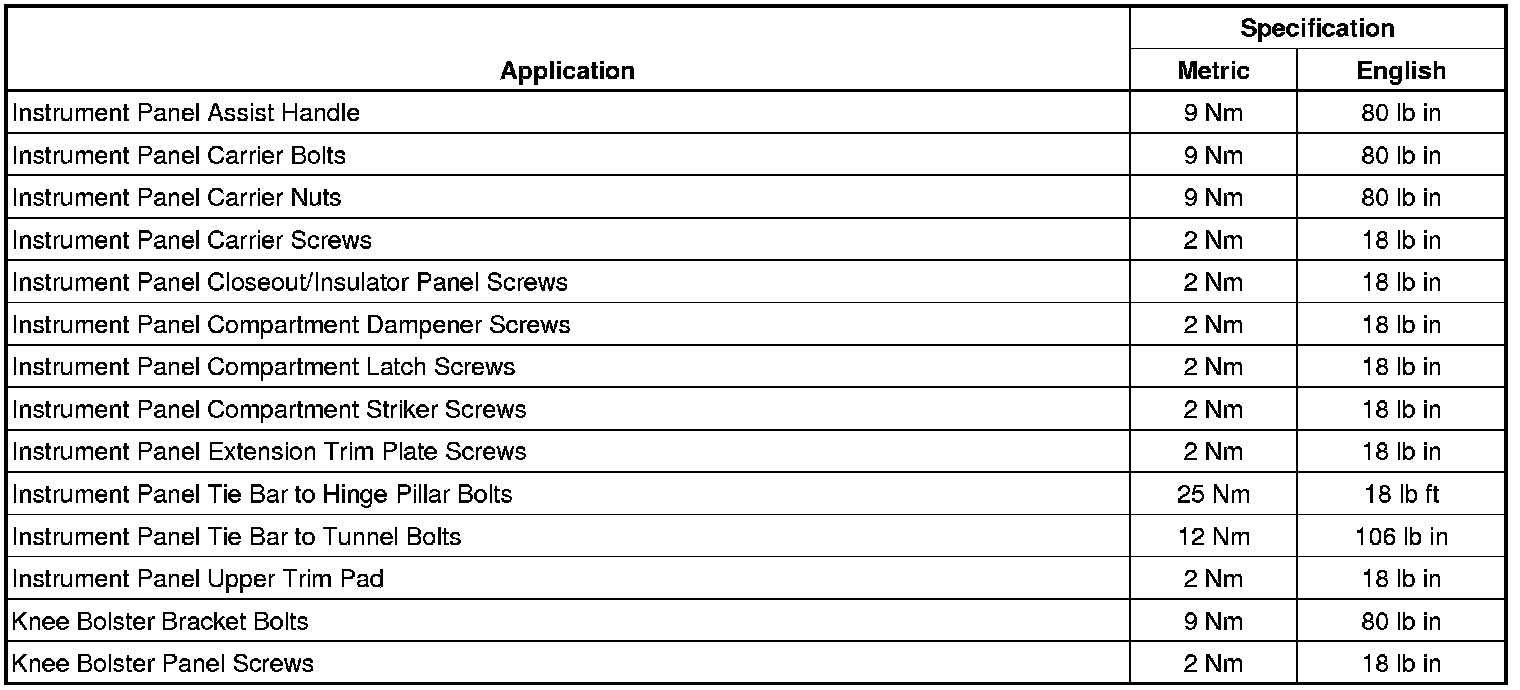 Instrument Panel and Console Trim - Fastener Tightening Specifications