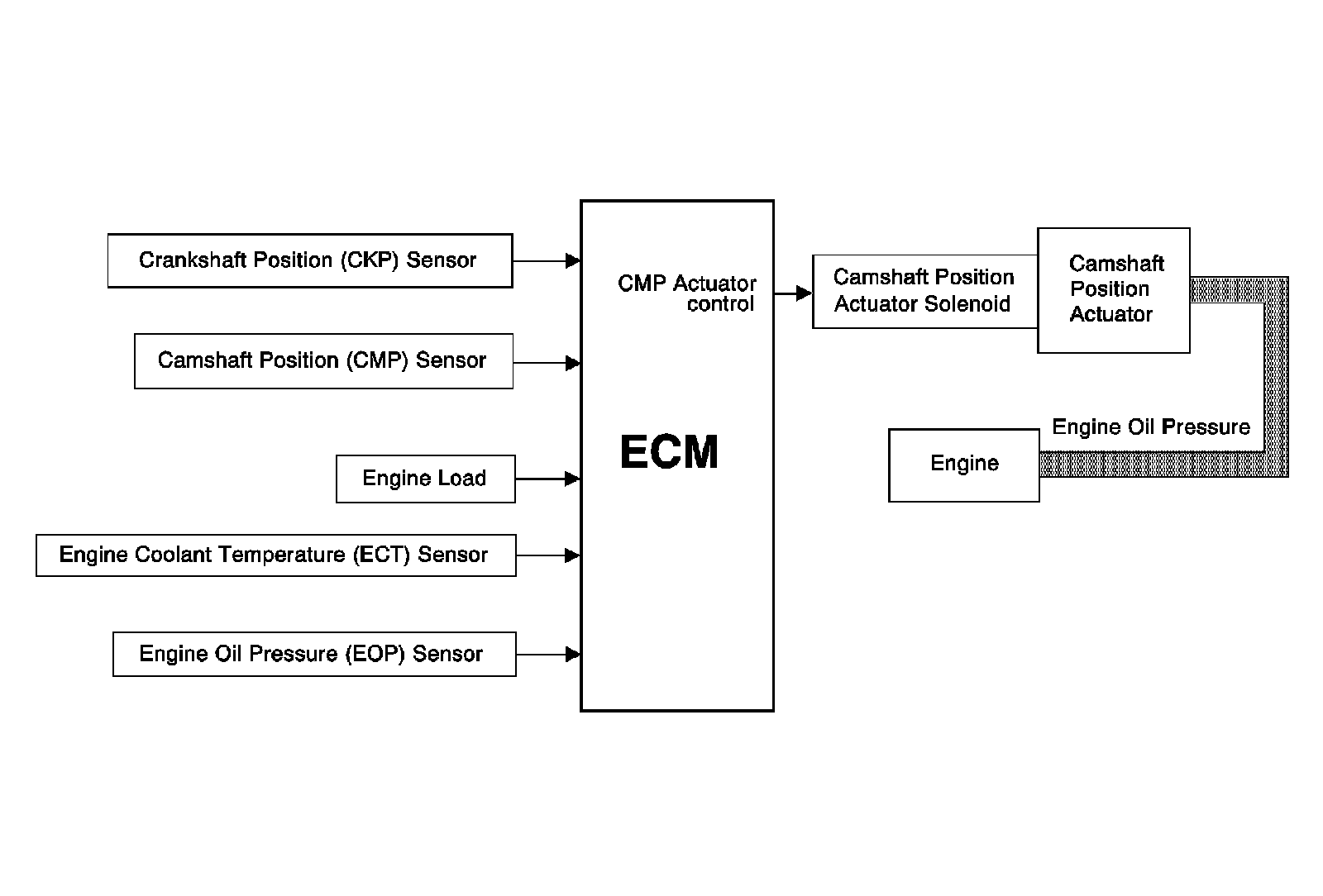 The camshaft position (CMP) actuator system is controlled by the engine control module (ECM). The ECM sends a signal to a CMP actuator solenoid in order to control the amount of engine oil flow to a Cam Actuator passage. The pressurized engine oil is sent to unseat the locking pin, and to the vane and rotor assembly of the CMP actuator. There are 2 different passages for oil to flow through, a passage for cam advance and a passage for cam retard. The Cam Actuator is attached to a camshaft and is hydraulically operated in order to change the angle of the camshaft relative to crankshaft position (CKP). Engine oil pressure (EOP), viscosity, temperature and engine oil level can have an adverse affect on Cam Actuator performance.