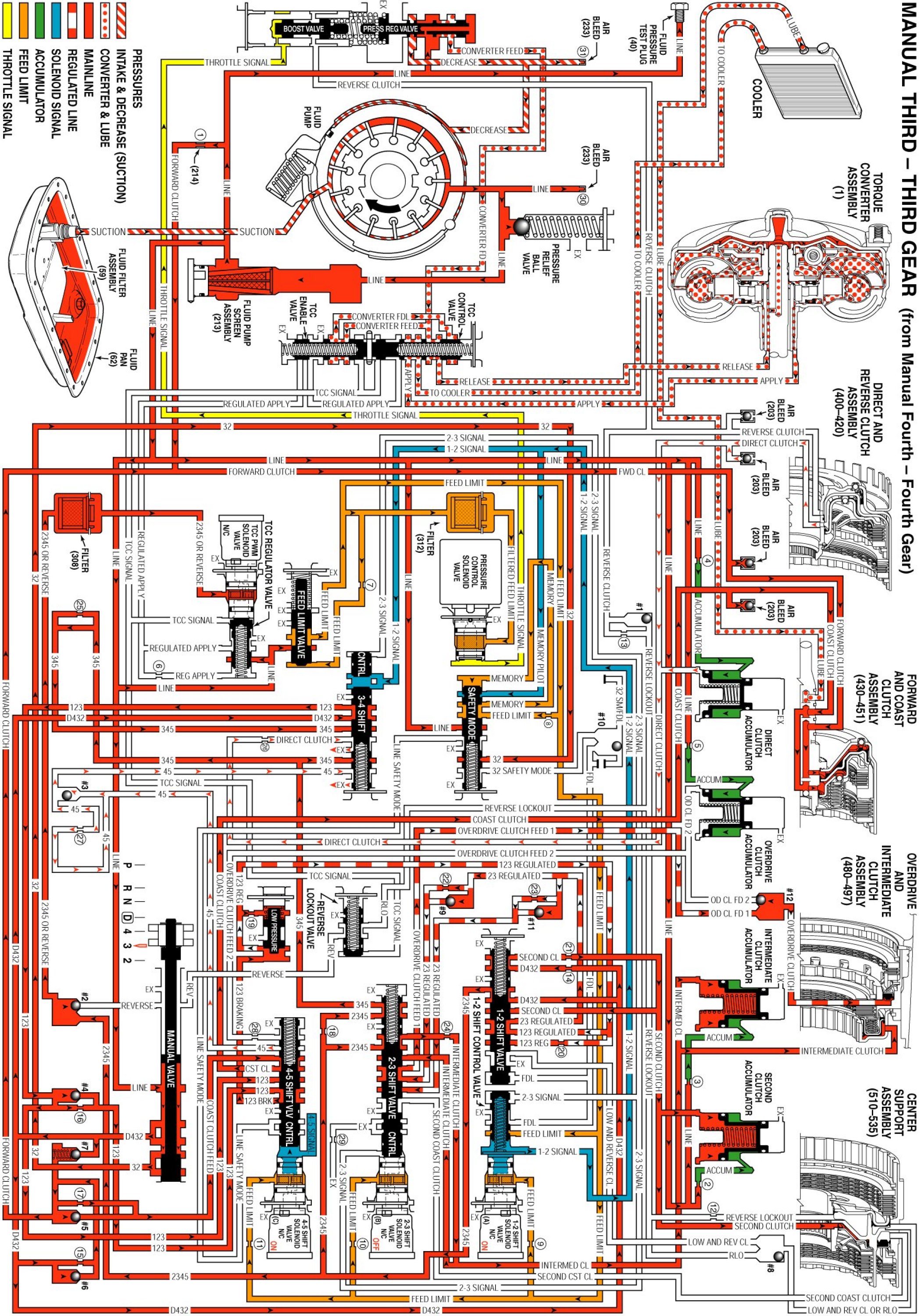 Manual Third - Third Gear may be selected at any time while the vehicle is being operated in a forward gear range. However, TCM control prevents the transmission from shifting above Third gear. When the gear selector lever is moved to Manual Third range from Manual Fourth - Fourth Gear, the manual valve also moves. Changes to the hydraulic and electrical systems are as follows: