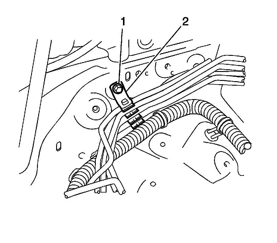 5. Install the brake line clamp (2) and secure with bolt (1).