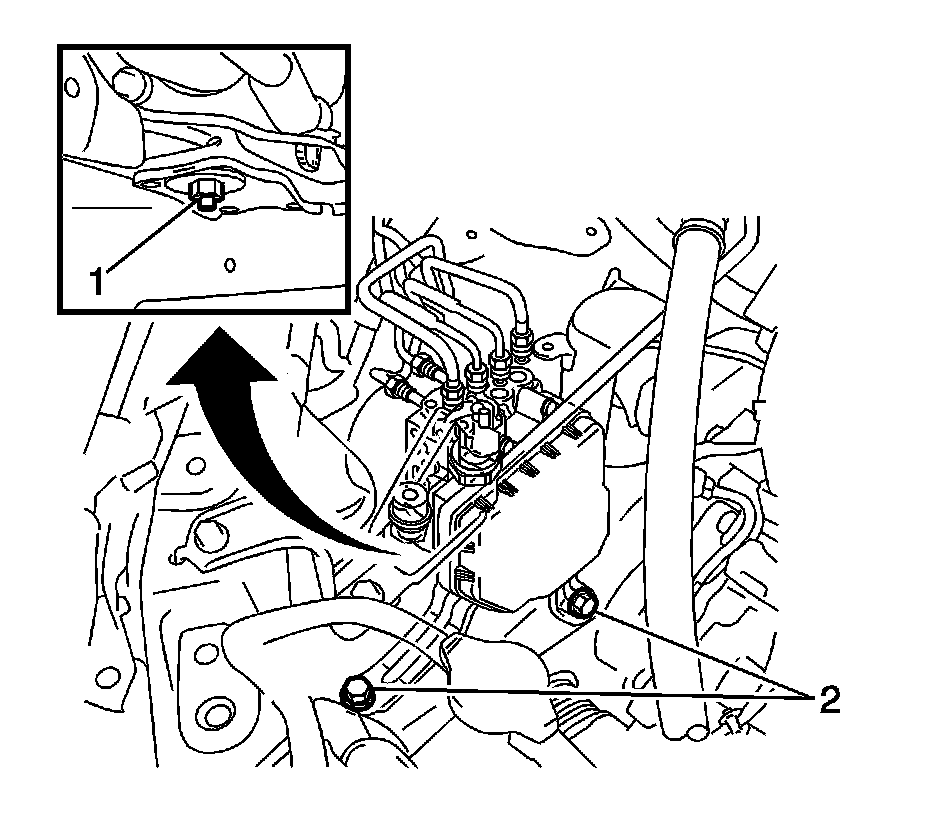2. Install the 2 bolts (2) to the brake pressure modulator bracket (3).