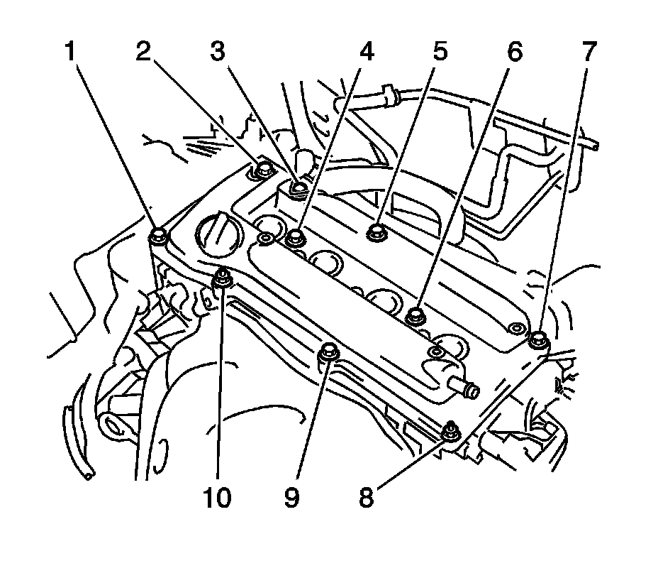 5. Remove the 8 bolts (1-7, 9) and 2 nuts (8, 10), then remove the cylinder head cover and gasket.