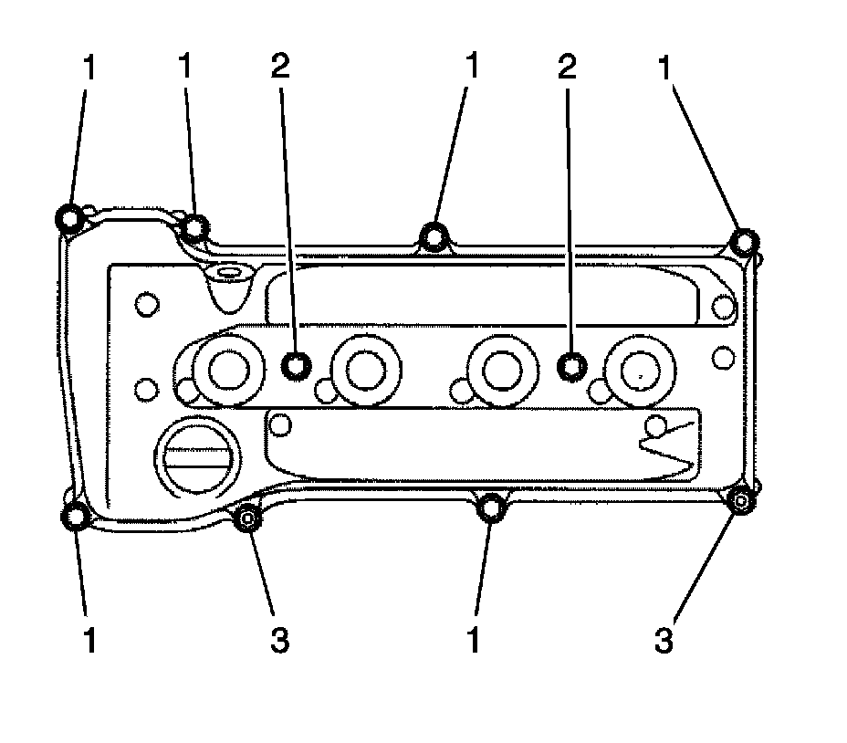 2. Install the cylinder head cover gasket and cover with the 8 bolts (1, 2) and 2 nuts (3), then tighten.